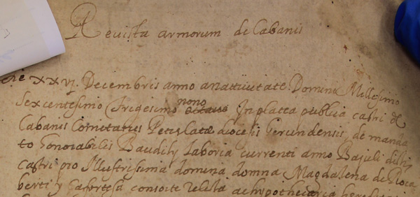 Els textos en llatí fan difícil la comprensió dels documents. A la primera revista només hi apareix citat el batlle, en canvi a la del 26 de desembre ens especifica que la convocatòria és feta per Baldiri Laboria, batlle, en nom de la Il·lustríssima Senyora Magdalena de Rocabertí i Safortesa vídua de l’Il·lustríssim Senyor don Francesc Jofre de Rocabertí i d’Anglesola, comte de Peralada i de dit castell de Cabanes, a Déu gràcies, vescomte de Rocabertí, i que queden convocats tots els homes entre els vint i els seixanta anys.