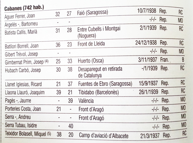 Font: Oliva i Llorens, Jordi. El cost humà de la Guerra Civil a les comarques gironines: combatents morts i víctimes de material bèl·lic abandonat. El Punt, 1999.