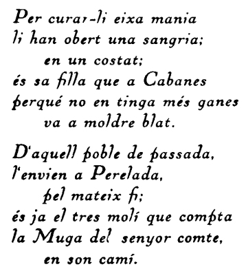 Per curar-li eixa mania li han obert una sangria, en un costat; és sa filla que a Cabanes perquè no en tinga més ganes va a moldre blat.D’aquell poble de passada, l’envien a Perelada, pel mateix fi; és ja el ters molí que compta la Muga del senyor comte, en son camí. (…) |