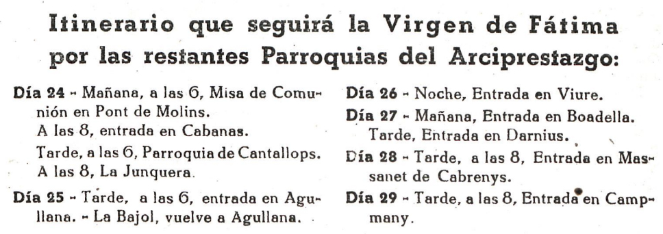 L’any 1950, amb motiu de la celebració de l’any sant, l’església va organitzar un pelegrinatge de la imatge de la Mare de Déu de Fàtima que la portà a recórrer moltes poblacions de Catalunya.