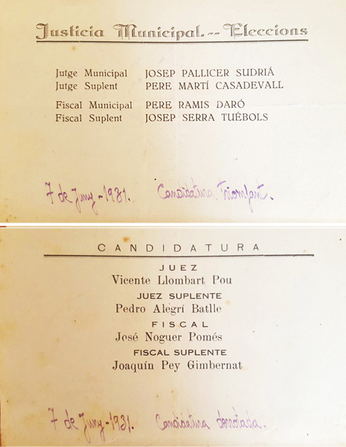- Primer Ayuntamiento: Juan Reverter Pallicer, Juan Oliva Fortià, José Gimbernat Teixidor i José Aguer Ginastera, pues actuó hasta últimos de mayo del mismo año 1939, pues actuaron 107 días