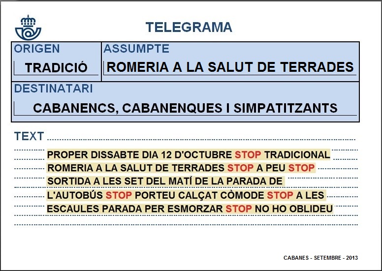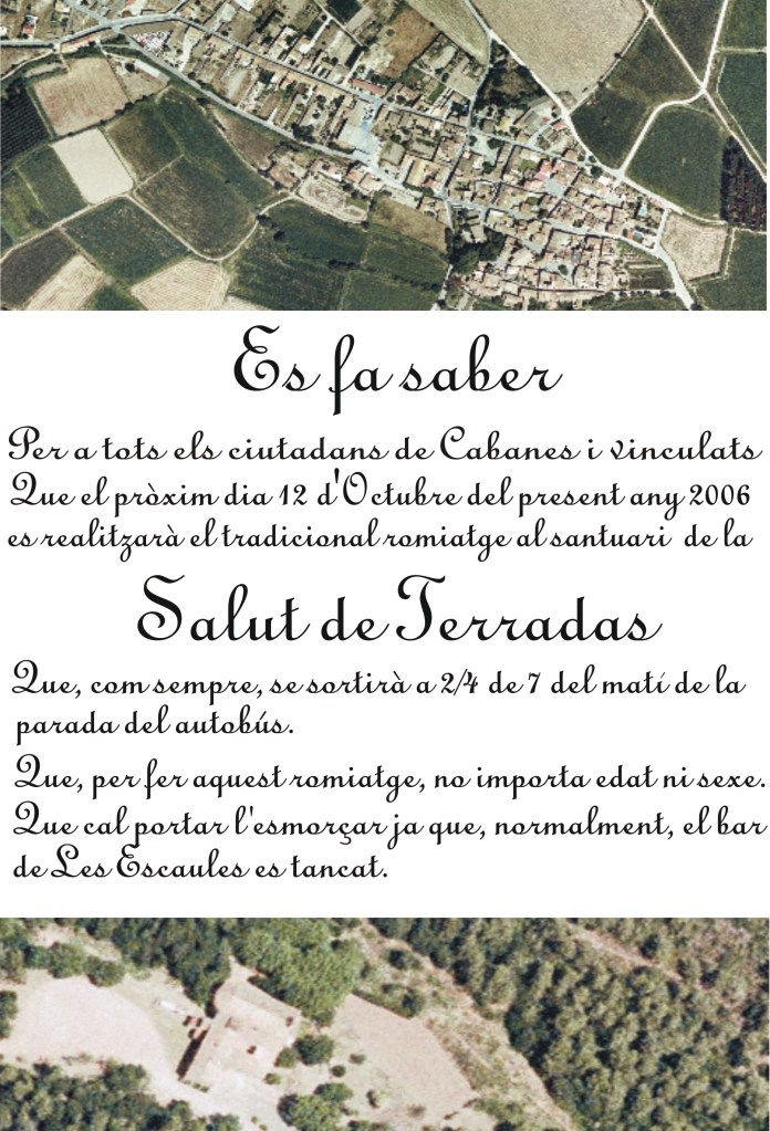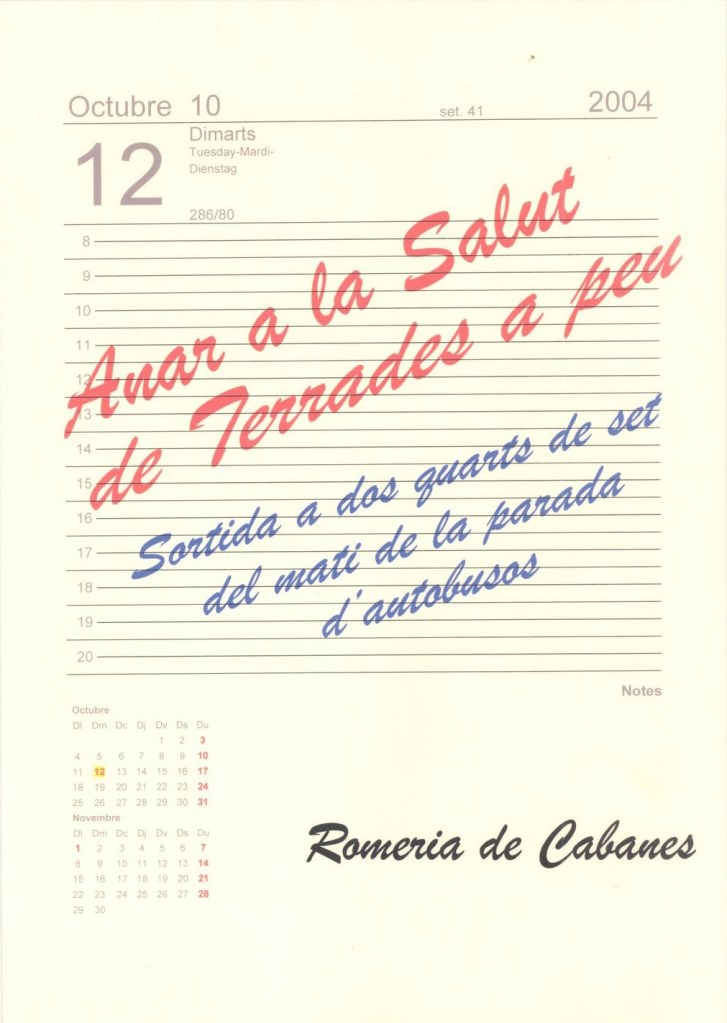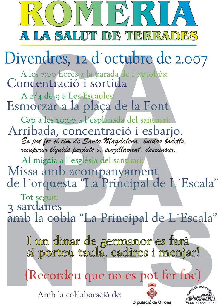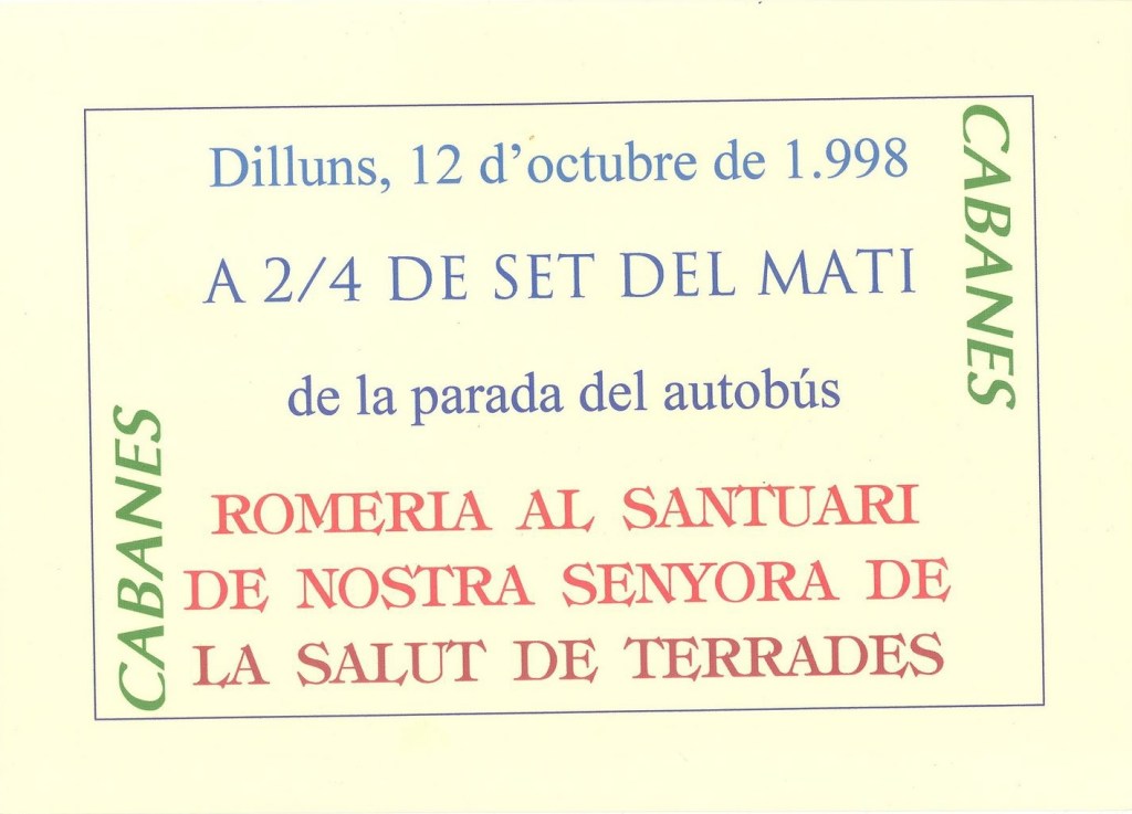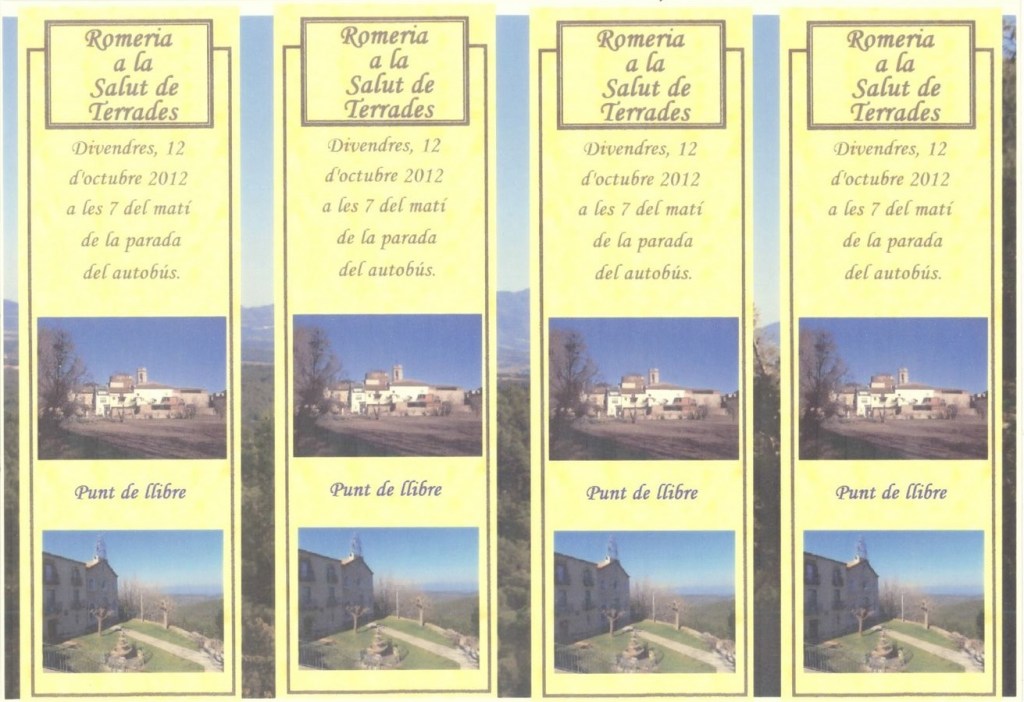 Exposició dels cartells de la romeria que es porta a terme anualment al Santuari de la Salut de Terrades (1993-2015). Recull a càrrec de Tomeu Poch i Gil Capallera.