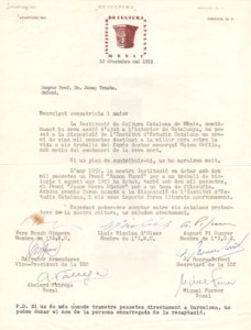 Paris, 18 de març de 1939. Sra. M. Baldó de Torres, Toulouse. Benvolguda amiga, En la impossibilitat de continuar en la banlieu parisenca, malgrat tenir uns parents pròxims, per oposar-s’hi les normes generals de la Prefectura, la senyoreta Joana Just, mestressa de la Generalitat, a la qual, segurament vostè coneix, es trasllada a Toulouse amb la nostra autorització i encomanada a la protecció del Comitè d’Ajut Tolosenc. Li prego doncs, vulgui rebre-la i orientar-la. Amb els millors records pel seu marit, rebi una afectuosa encaixada del seu amic. Antoni M. Sbert. A: Puigarnau Torelló, Xavier. Economia i cultura en el primer exili França (1939-1940) Les finances de la Generalitat de Catalunya i les residències de Montpeller i Tolosa. Tesi doctoral UPF, 2014
