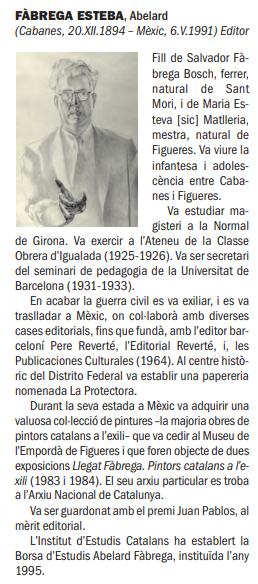 – Capella, Anna. El Museu de l’Empordà, entre els llegats i l’art contemporani. Revista de Girona, 246 (2008) … L’any 1982, el matrimoni Abelard i Joana Fàbrega, ell originari de Cabanes, va fer donació al Museu de la seva col·lecció d’obra –olis, pintures i gravats– d’artistes catalans exiliats a Mèxic, amb els quals mantenien relació per la seva tasca editorial i cultural en aquell país. Aquest particular i històric conjunt que recull peces de personatges tan diversos com Montserrat Aleix, Pompeu Audivert, …