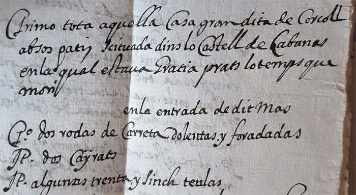 Es conserva un inventari de “tota aquella casa gran dita de Corcoll ab sos patis scituada dins lo castell de Cabanes en la qual estava Gratia Prats lo temps que morí“. No hi consta data, però sabem que la Gràcia va morir el 8 de març de 1642.  La casa constava de: entrada, 1 sala gran, 2 cambres, 1 cambra amb estudi, 1 sala petita, la cambra nova, 1 cuina, 1 veritable cuina, 1 reboster, 1 graner, 1 celler, 1 estància prop dels tarongers, 1 cuina baixa [transcripció de l’inventari]