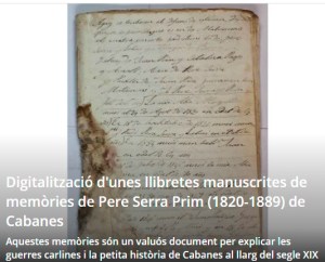 - Digitalització d’unes llibretes manuscrites de memòries de Pere Serra Prim (1820-1889) de Cabanes. Xarxa d’arxius comarcals, 17/1/2018