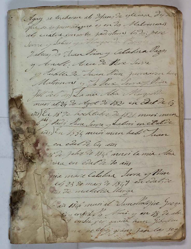 Aquy se trubaran als difuns de esta casa des de que se es furmada que es en dos matrimonis als cuatra consortes fadristerns los dos: Pere Serra y Labori y Margarida Bruses y altres dos Juan Prim y Catalina Pages y Arnall. Areu de Pere Serra y pubilla de Juan Prim furmaren hun matrimoni y jo Pere Serra y Prim fill dels dos.