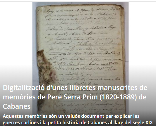 Pere Serra i Prim (Cabanes, 1820-1889) va deixar constància escrita de les seves vivències, del que passava al seu entorn i del que llegia a la premsa. Les seves memòries són un valuós document per explicar les guerres carlines i la petita historia de Cabanes al llarg del segle XIX.