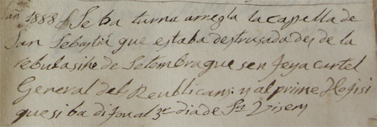Lañ 1888 se ba turna arregla la capella de San Sebastiá que estaba destrusada des de la rebulasiho de setembra que sen feya Curtel General dels republicans y al primer hofisi que si va di fou al 3r dia de Sn Visens