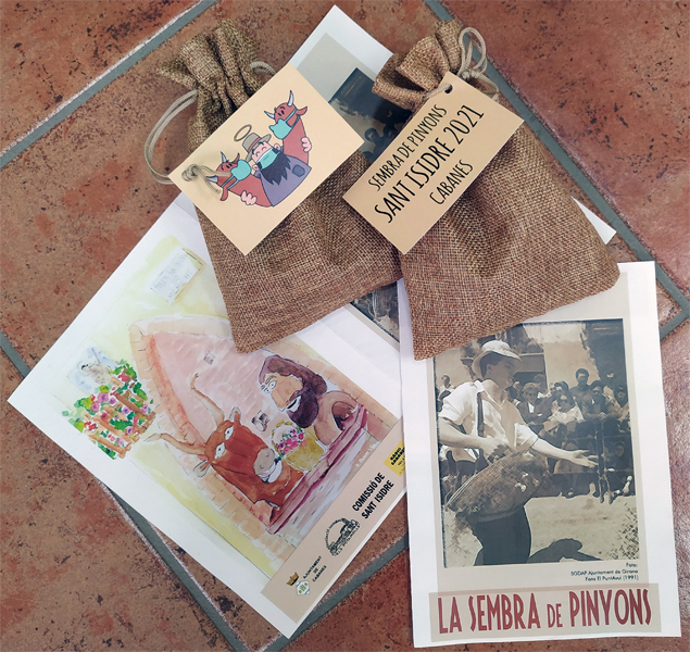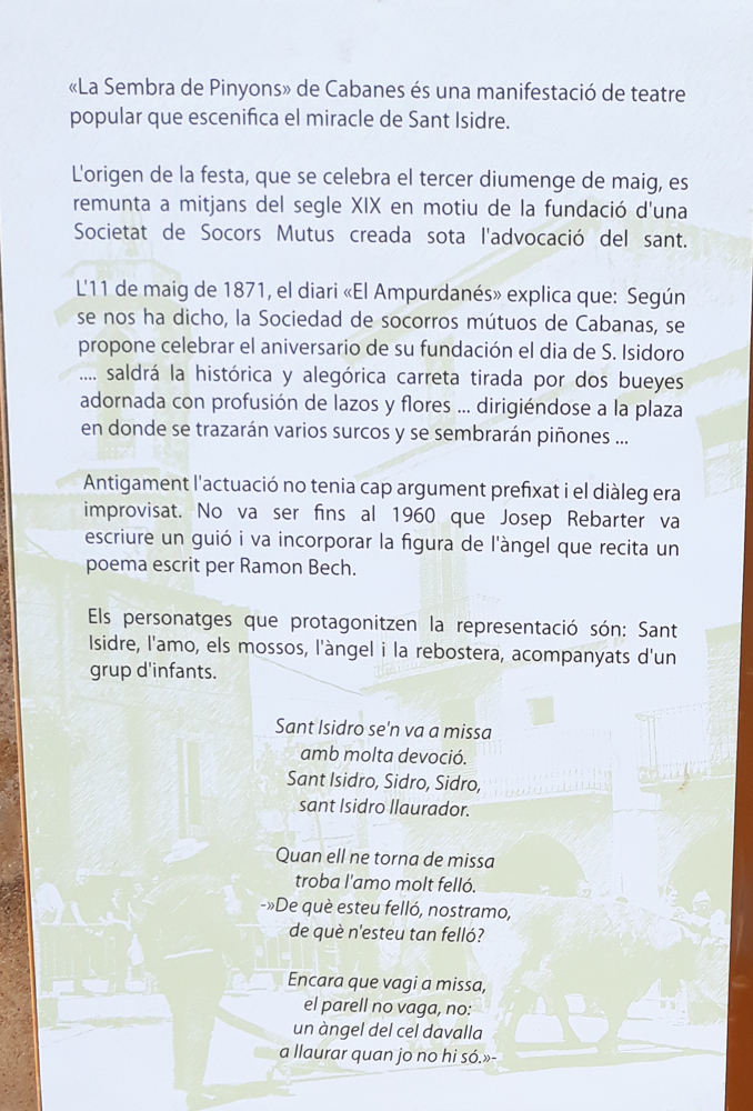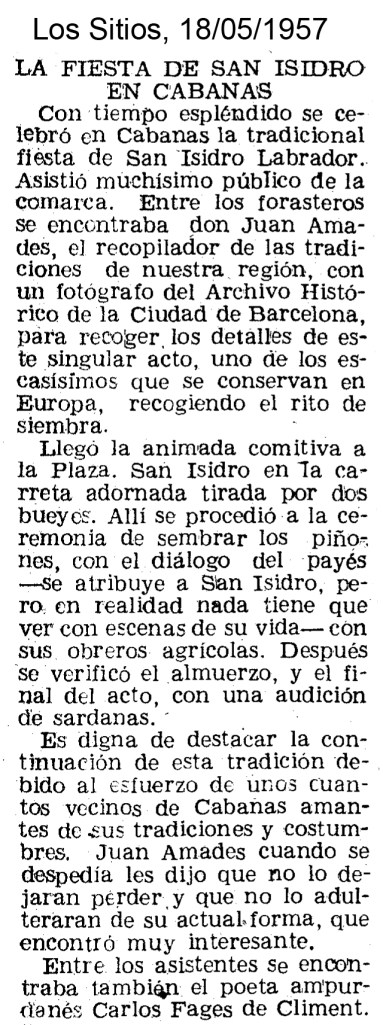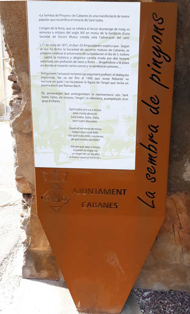 1928.- Cabanas. La Vanguardia, 22/05/1928, pàg. 31. La nota explica la festa amb aquests termes: Después del oficio se hizo en al plaza la tradicional siembra de «pinyes i pinyons», costumbre antigua, que reúne a un gran contingente de personas en la plaza, siendo uno de los actos principales del programa. El joven José Terrats representó al popular San Isidro labrador, siendo sus mozos los jóvenes Juan Tuebols y Juan Pellicer. La rebostera que sirvió el almuerzo fue la distinguida y linda señorita Teresita Planella…