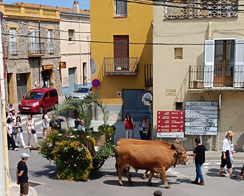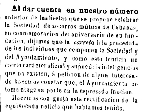L’11 de maig de 1871, el diari «El Ampurdanés» explica que: Según se nos ha dicho, la Sociedad de socorros mutuos de Cabanas, se propone celebrar el aniversario de su fundación el dia de S. Isidoro …. saldrá la histórica y alegórica carreta tirada por dos bueyes adornada con profusión de lazos y flores … dirigiéndose a la plaza en donde se trazarán varios surcos y se sembrarán piñones …