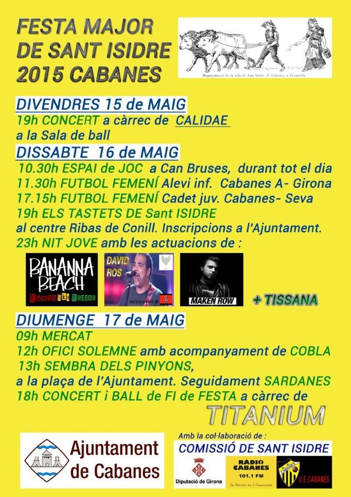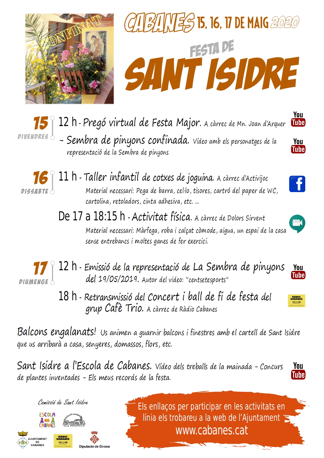 2020.- Ajuntament de Cabanes. Aquesta setmana estaríem de Festa Major. Tot i això hem preparat un seguit d’activitats per seguir des de casa. En breu trobareu a la web de Cabanes tota la informació per participar a cada activitat. Us anirem avisant. Agraïm la participació de la Comissió de Sant Isidre, Potamolls, Ràdio Cabanes i l’Escola de Cabanes.