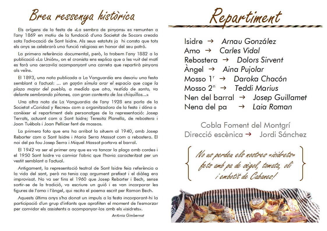 2011 – Sant Isidre: Lluís Nierga Rebostera: Geanina Morela – Amo: Marc Clos – Àngel: Mireia Costa – Mossos: Rafel Roura, Julian Alvarez i Jordi Puig – Mainada: Rita Miret i Marc Martínez