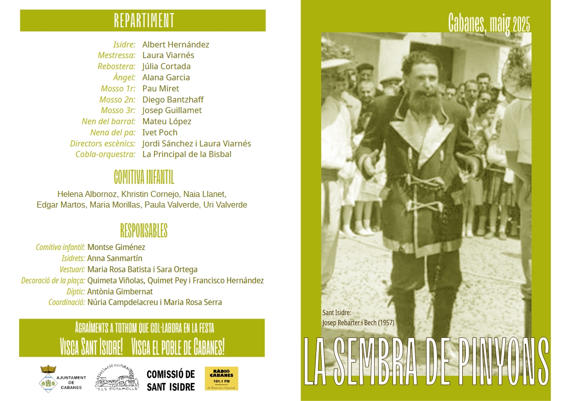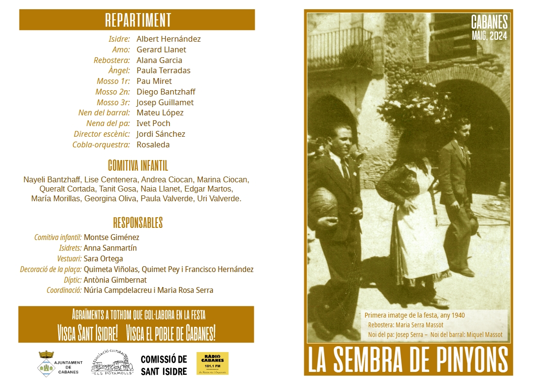 2024 – Isidre: Albert Hernández. Amo: Gerard Llanet. Rebostera: Alana Garcia. Àngel: Paula Terradas. Mossos: Pau Miret, Diego Bantzhaff i Josep Guillamet – Mainada: Mateu López i Ivet Poch. Direcció escènica: Jordi Sánchez – Cobla-orquestra: Rosaleda. Comitiva infantil: Nayeli Bantzhaff, Lise Centenera, Andrea Ciocan, Marina Ciocan, Queralt Cortada, Tanit Gosa, Naia Llanet, Edgar Martos, María Morillas, Georgina Oliva, Paula Valverde, Uri Valverde. Responsables – Comitiva infantil: Monts Giménez – Isidrets: Anna Sanmartín – Vestuari: Sara Ortega – Decoració de la plaça: Quimeta Viñolas, Quimet Pey i Francisco Hernández – Díptic: Antònia Gimbernat – Coordinació: Núria Campdelacreu i Maria Rosa Serra