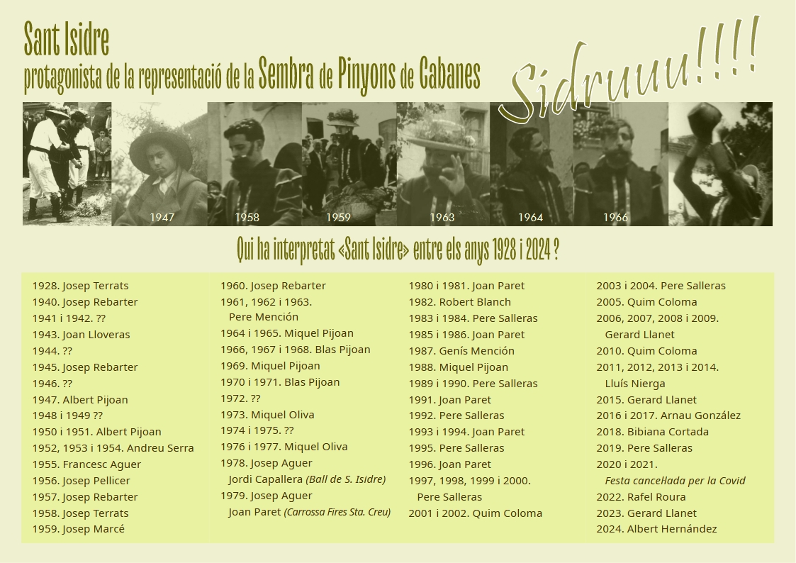 1963 – Sant Isidre: Pere Mención – Rebostera: Joaquima Rebarter – Amo: Josep Marcé – Àngel: Joaquim Pey – Mossos: Ramon Prunella, Isidre Olivet i Joaquim Santiago – Nens: Vicenç Cusí i Joan Marcè – Organització i direcció: Agrupació teatral – Orquestra: Mediterránia de Gerona