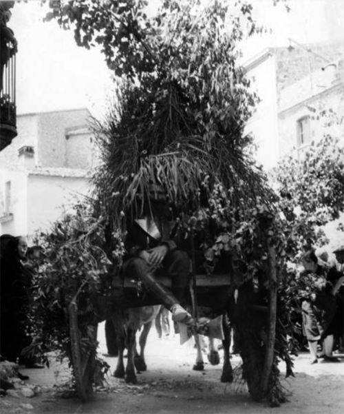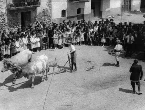 1893.- La quincena agrícola. La Vanguardia, 03/06/1893, pàg. 4. Descriu la festa i diu: … un gayán simula arar el espacio que coge la plaza mayor del pueblo, a medida que otro, vestido de santo, va delante sembrando piñones, con gran contento de los chiquillos…»