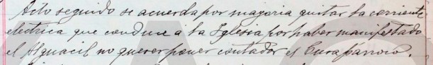 … el señor presidente Don Juan Pou y Bruses … manifesto que debian tomar resolucion acerca la costumbre establecida desde tiempos muy remotos, de solemnizar los dias de la fiesta mayor de este pueblo en referencia a la musica y funciones de iglesia, vista la actitud tomada por los mayordomos (pabordes) desentendiendose de toda obligacion … unanimes acuerdan …. … 3º y último que en virtud de haberse desentendido los pabordes de toda obligacion acerca la musica y demas anexidides en los dias de la fiesta mayor y no teniendo cantidad alguna presupuestada para festejos o funciones de Iglesia y publicas, el Ayuntamiento debe desentenderse y se desentiende de toda obligacion o compromiso para los fines indicados; y considerando que el vecino de este pueblo Don Jose Clos y Sot se presento manifestando que en caso de desacuerdo con los pabordes el se ofrecia para hacerse cargo de los musicos para los dias expresados a cuenta suya, el Ayuntamiento acuerda, ceder este derecho al expresado Jose Clos y Sot mediante empero la obligacion de ceder la musica para las funciones de Iglesia si alguno tiene deseo de que los haya como los años anteriores y la de hacer todas las pasadas por el pueblo de costumbre y bayle publico o sardanas por la tarde en la plaza de la Republica de este pueblo sin ninguna clase de retribucion por parte del Ayuntamiento …
