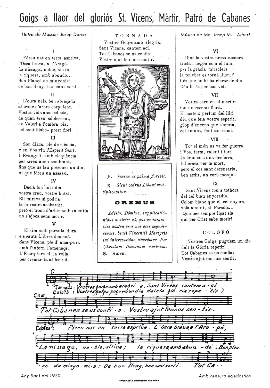 1936. Festa Major de Sant Vicenç. Agrupacions musicals que cooperen a aquestes festes. Cobles: La principal de Cassà de la Selva i Girona de Girona. Cabanes, l’atractívola població feinera i festívoIa, té llogfades dues Cobles. L’animació que regna, és remarcable. Publicacions de la terra, 81, 21/1/1936, pàg. 1 i 3