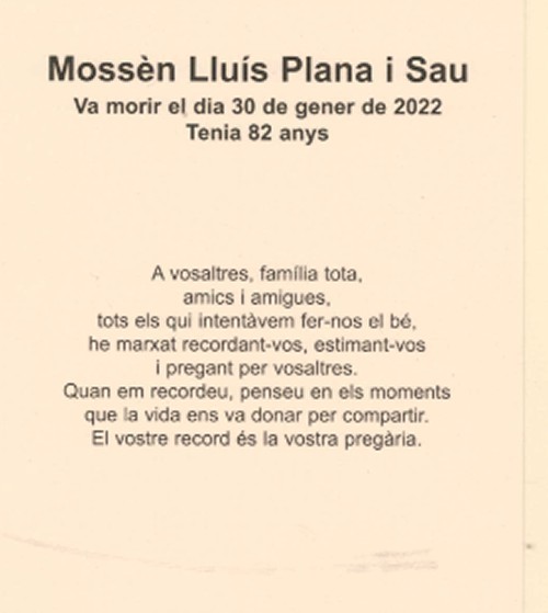 Romero i Dalmau, Alfons. Ahir vam dir adéu al mossèn Lluís Plana. Van arribar amb en Joan Mollerusa ara fa anys i en Lluís ha viscut amb nosaltres durant molts d’anys. Ara hem sabut que venien en missió especial del bisbat per a trencar l’hegemonia del nacional catolicisme dels dos mossens de la ciutat. El camp de batalla fou el Patronat una institució antirepublicana que s’ofegava en la seva esclerosi. Els dos preveres joves s’apuntaren a la transformació d’aquest espai de la vella catequesi a un nou centre cultural que s’obria a la ciutat. El seu despatx de la primigènia Sagrada Família era el centre d’innombrables escrits per a l’esperança. Nosaltres hi posàvem el paper i ell la màquina i la tinta. Una nova sagrera on s’exercitava una altre Pau i Treva de Déu al servei de la democràcia i de Catalunya. Amb el seu ciclostil vam ser capaços d’editar per a l’Assemblea de Catalunya un facsímil de l’Estatut de Núria. Així quan cridàvem llibertat, amnistia i Estatut d’autonomia poguéssim saber de què parlàvem. Una obra artesanal que certificava el pas de les velles vietnamites a les noves tecnologies del moment.