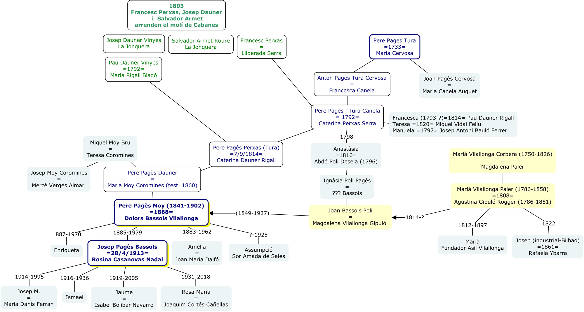 Josep Pagès Bassols (1885-1979), hereu de la parella, el 28 d’abril de 1913, es va casar -a Vilassar- amb Rosina Casanovas Nadal (1891-1974), filla de Josep Casanovas Guardiola (1867-1939) i Maria Nadal Bosch. Josep i Rosina van tenir quatre fills: